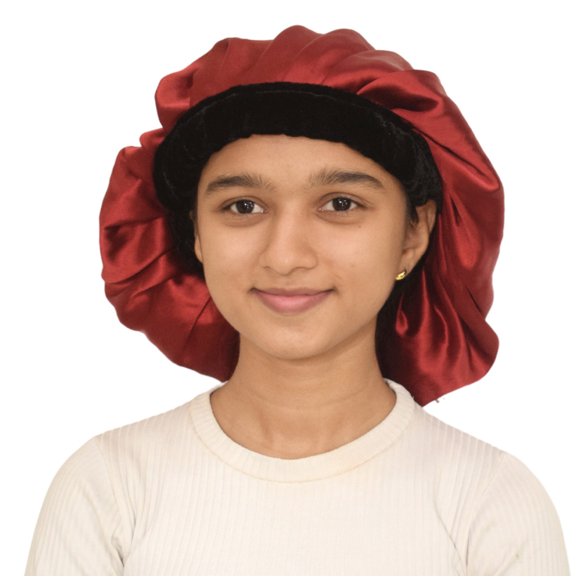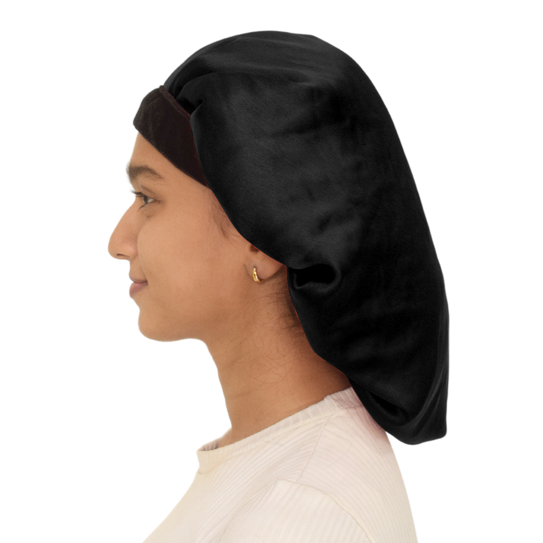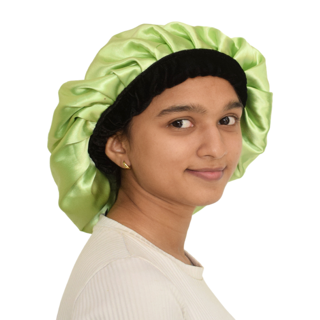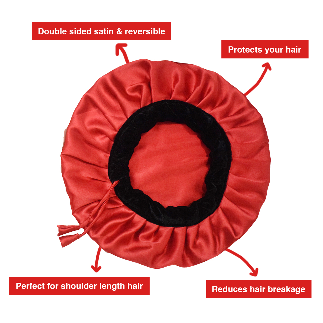 Designed especially for shoulder-length hair, our Satin Short Bonnet is round in shape and reversible, with satin on both sides for maximum protection. It features a soft velvet band and a tying option to keep it snug and comfy all night. Whether you’re catching up on beauty sleep or just lounging in style, this bonnet has your back (and your hair).